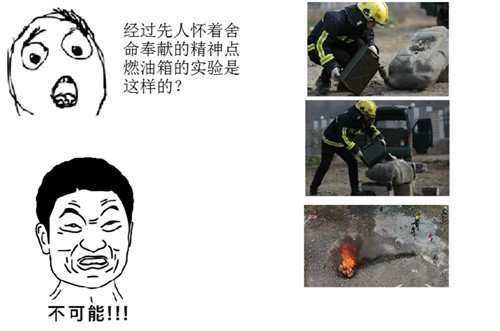 经过先人怀着舍命奉献的精神点燃油箱的实验是这样的: