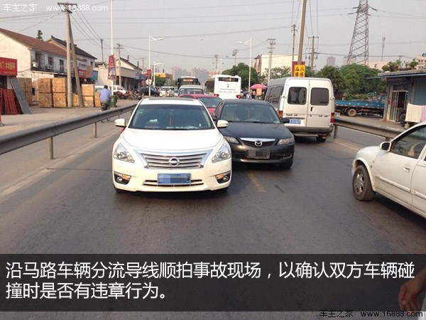 拍照目的:最重要一步,看车辆是否压线等,撞击瞬间是否处于违章状态,用于判定责任,属于最有力用的一张照片。