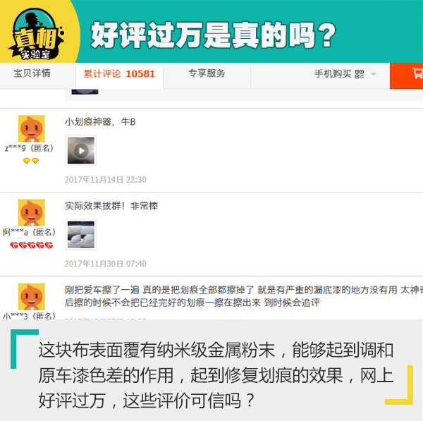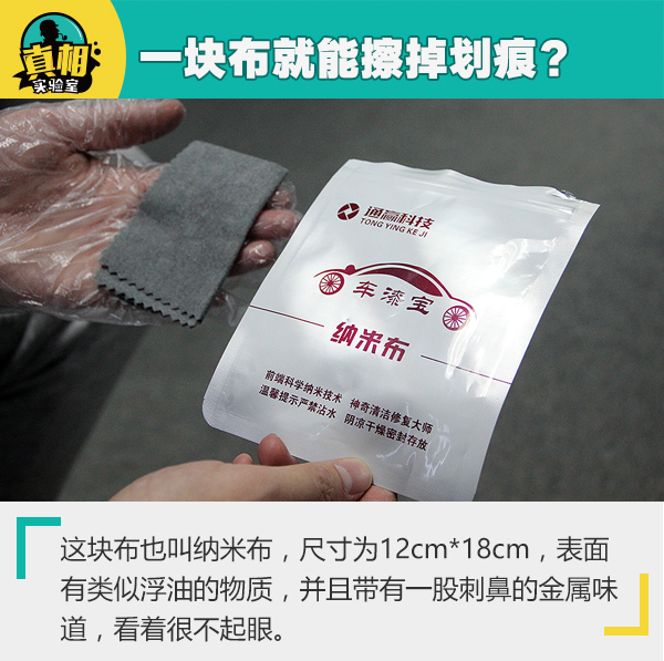 【搜狐汽车真相实验室】(图/文 郝昭)在大家的用车生活中,无论如何小心,爱车的小剐小蹭还是很难避免。车漆留下划痕之后要么去店里花钱重新喷漆或者抛光处理,要么就留着碍眼。有没有什么办法能够少花钱少麻烦,自己动手解决呢?我们在网上看到一种号称能够把划痕擦掉的布,好评竟然过万。抱有几分怀疑的态度,我们买来这块“神奇”的布,本期《流言终结者》栏目我们就为您实际体验一下这块布到底能不能擦掉划痕。
