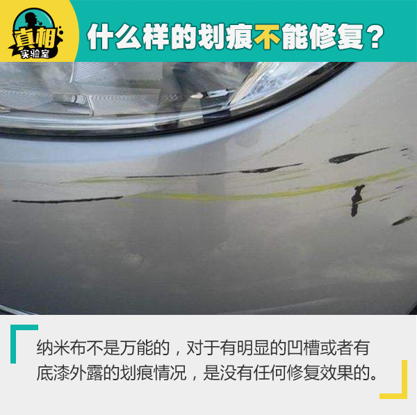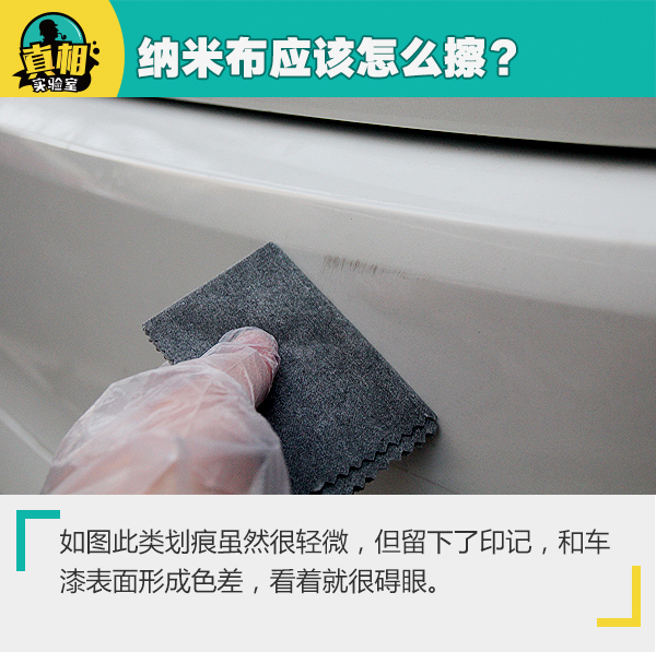我们找来一辆擦伤较深的银色车辆,使用纳米布擦拭之后发现,有凹槽的划伤是没有办法修复的,如果伤及底漆,修复效果为零。