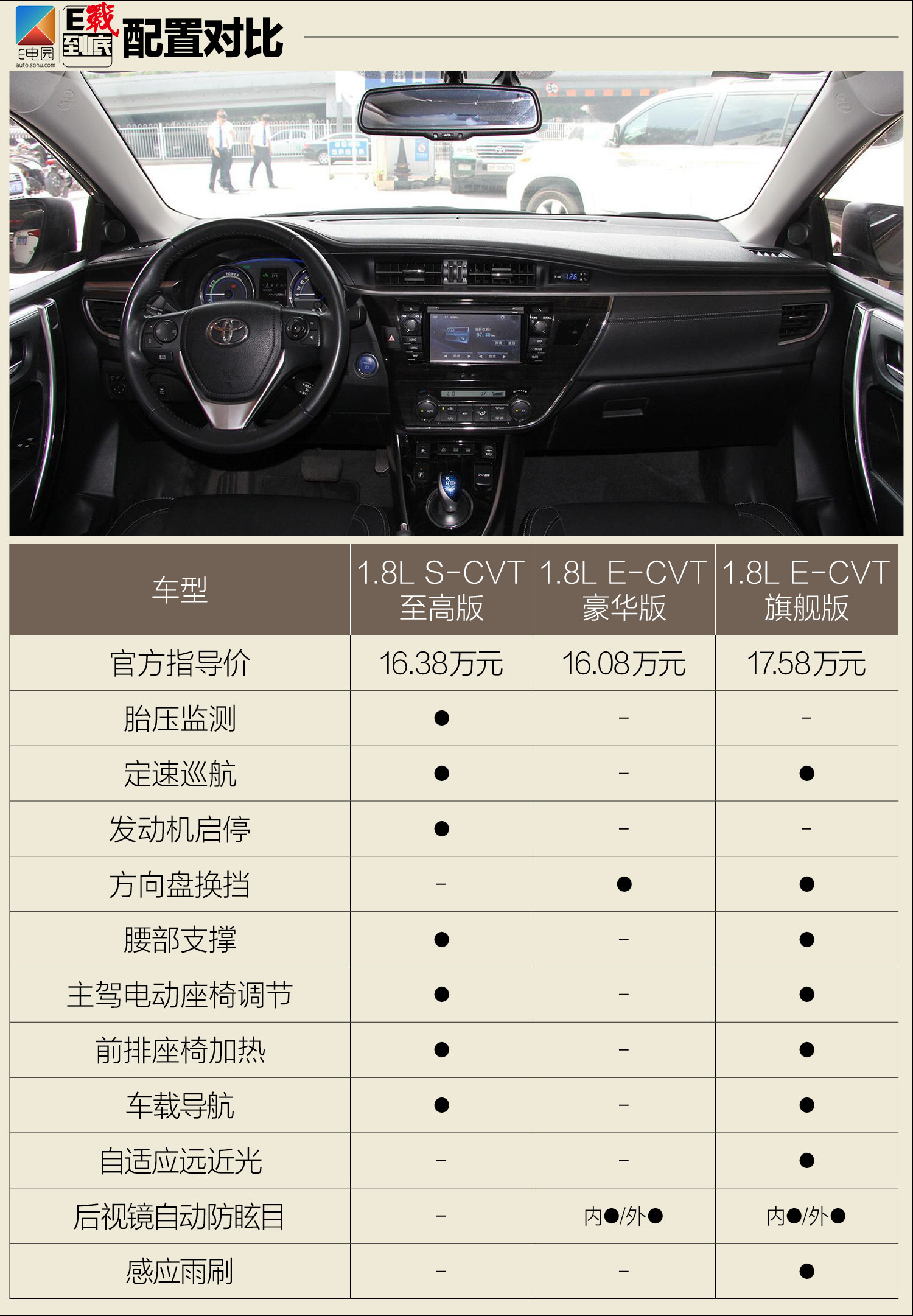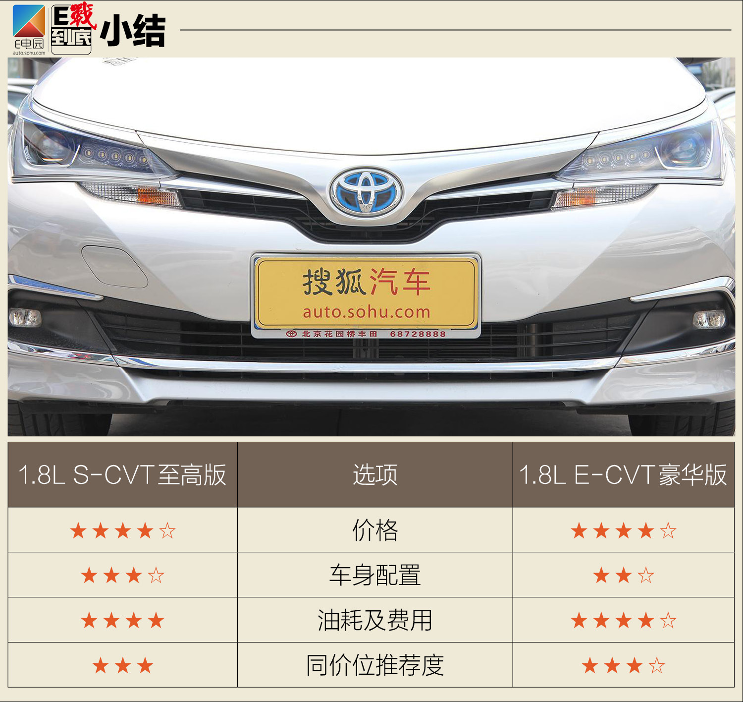 为了更为直观的对比,我们也选择了价格最相近的两款车来看看汽油版和混动版在配置上的差别。而通过对比我们可以看到售价为16.38万元的1.8L至高版车型和售价16.08万元的1.8L双擎豪华版在配置上的差别并不大,汽油版车型会稍微多一些舒适性配置,包括主驾电动座椅调节、前排座椅加热以及车载导航,并且还多了胎压监测和定速巡航功能。而混动版车型上配有的内外后视镜自动防眩目功能却是在汽油版车型上没有配备。