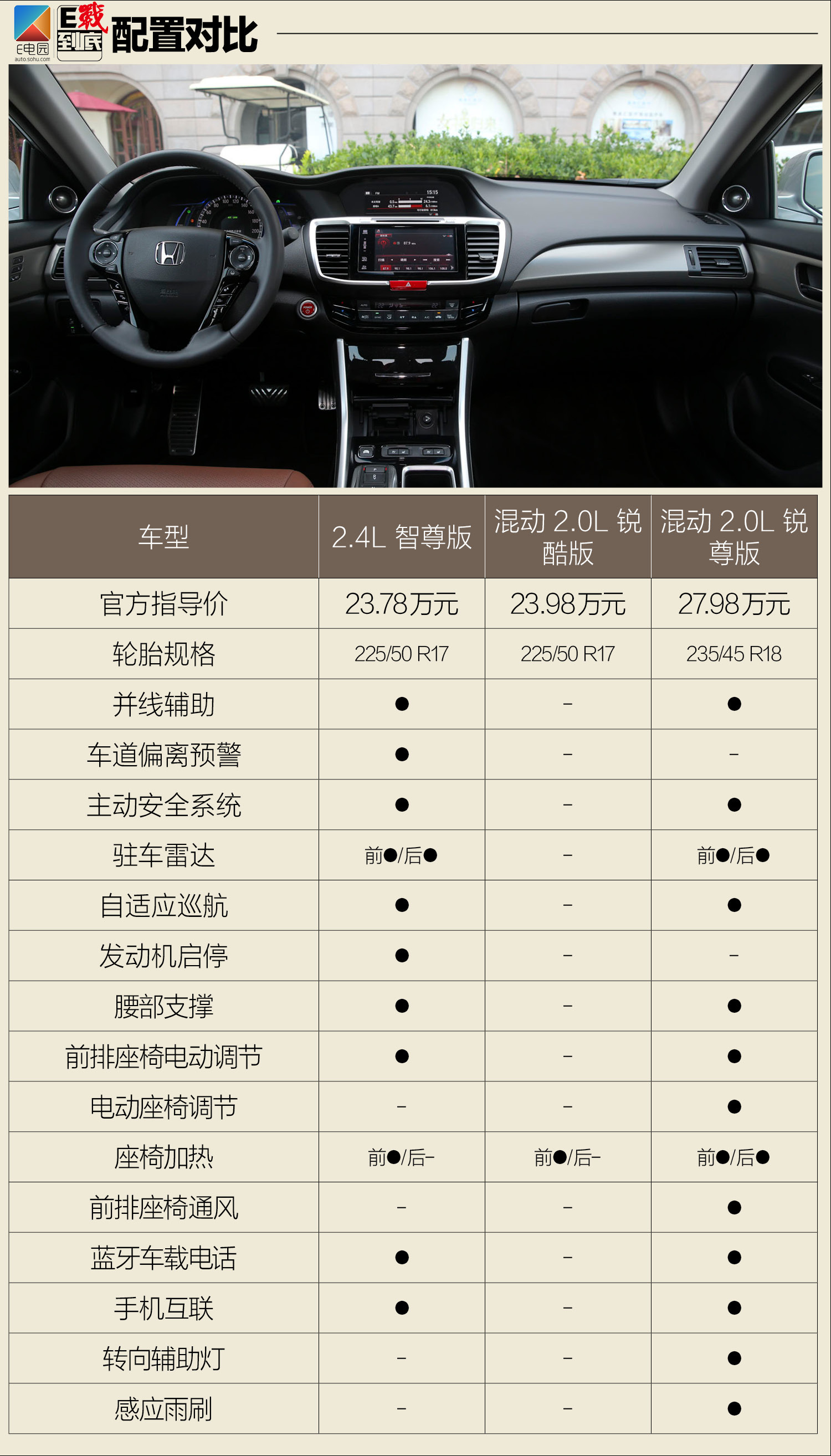 雅阁的汽油版车型和混动版车型的价格差相对比较大,汽油顶配甚至还不如混动低配价格高,所以对比起来也就可以看出很明显的配置差异。但是如果将两个动力的顶配车型进行比较,虽然配置是跟上甚至反超了,但价格却相差了有4.2万元之多。
