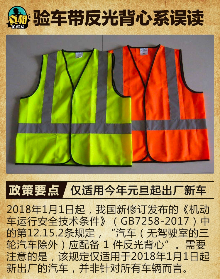 而实际上,该传闻完全是因为网友对国家出台的一项新规定产生了误读所致。从2018年1月1日起,我国新修订发布的一项国家标准即《机动车运行安全技术条件》(GB7258-2017)开始正式实施,该标准第12.15.2条规定“汽车(无驾驶室的三轮汽车除外)应配备 1 件反光背心”,目的在于保证汽车于等低能见度条件下发生故障或意外情况时,能够提升驾驶员在车外道路上行动时的可视性,从而降低发生次生事故的风险。