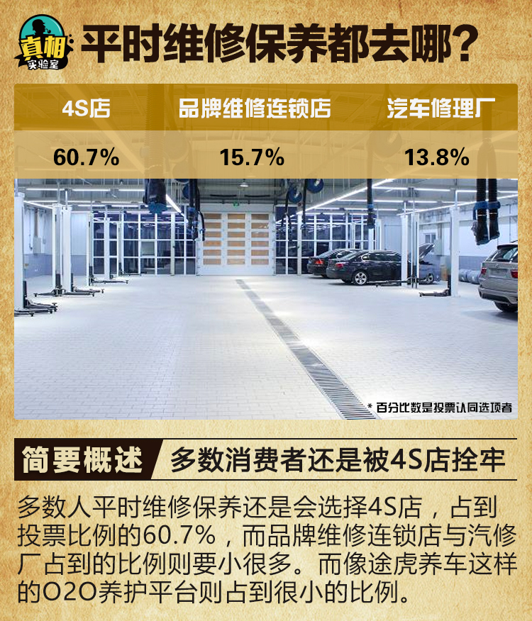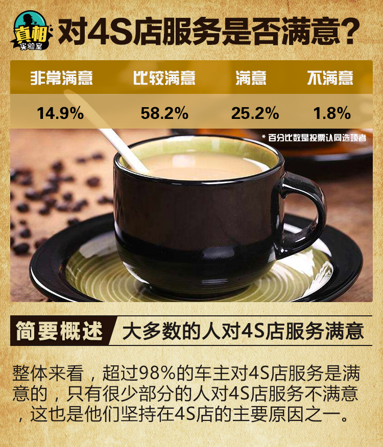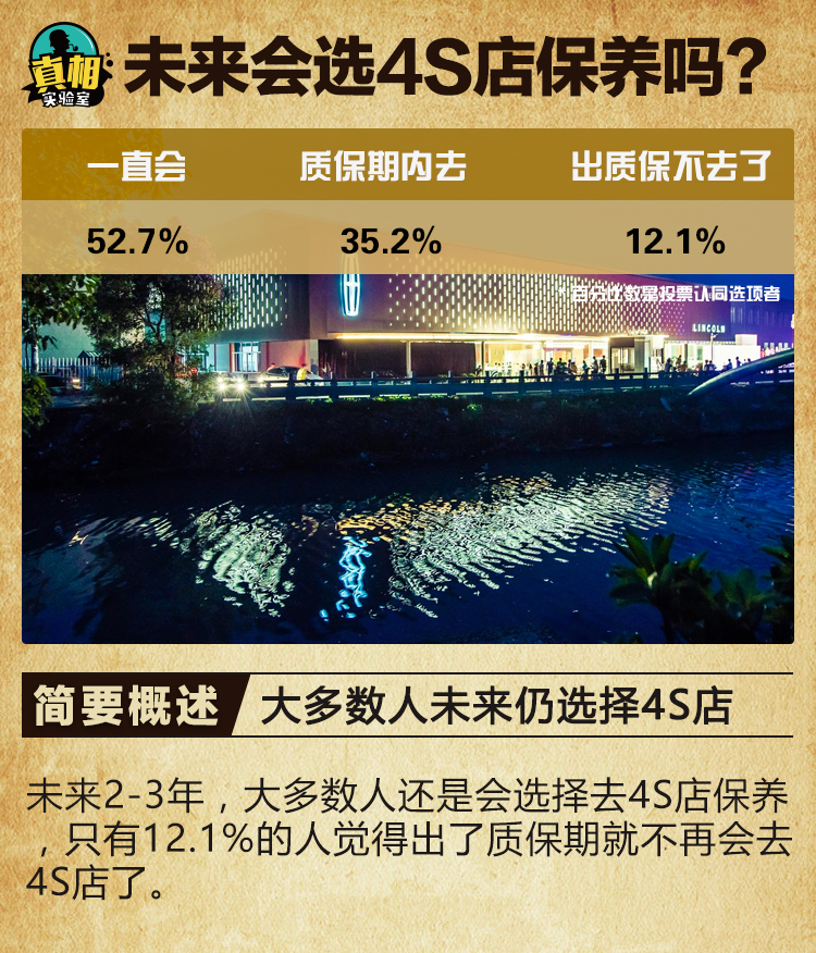 不过,大家还是会在未来选择去4S店保养,因为4S店还是比其它汽修店看上去更专业,更官方,并且多数消费者还是对4S服务基本满意的。即便遇到不愉快的事情,如果问题解决了多数人也还是会再去,实在不行就换一家4S店,很少有人选择放弃4S店。