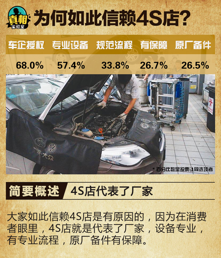 当然不一定所有的4S店都能提供专业的服务,这点在调查中也有所体现,那就是同品牌的不同4S店服务水平参差不齐。4S店实际上是一个独立的经销商,并不是厂商直营的机构,它与厂商的关系属于互帮互助,所以每一个4S店就是一个独立的企业,虽然很多设备与保养产品都来自于厂商,但工人的水平则并不统一,管理也不尽相同,因此差异也更大,需要消费者多观察分辨。