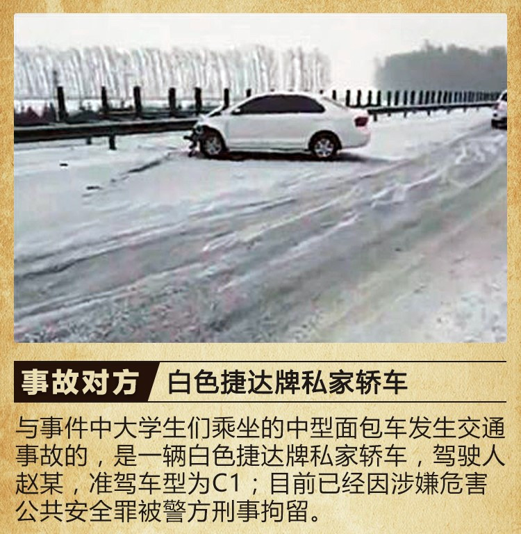 据哈尔滨警方事故调查通报称,大学生们乘坐的中型面包车为汇众牌普通客车,注册地点为黑龙江省牡丹江市海林市,车辆使用性质为非营运车辆。该车核载15人,发生事故时实载12人。驾驶人冯某,准驾车型为A1A2,已于事故发生时当场死亡,车主唐某系黑龙江省海林市人。此次事故的另一方,即与面包车追逐竞驶的小轿车为捷达牌私家车,驾驶人赵某,准驾车型为C1。目前,肇事面包车车主唐某、小轿车驾驶人赵某,分别因涉嫌非法经营罪和危害公共安全罪被警方刑事拘留。