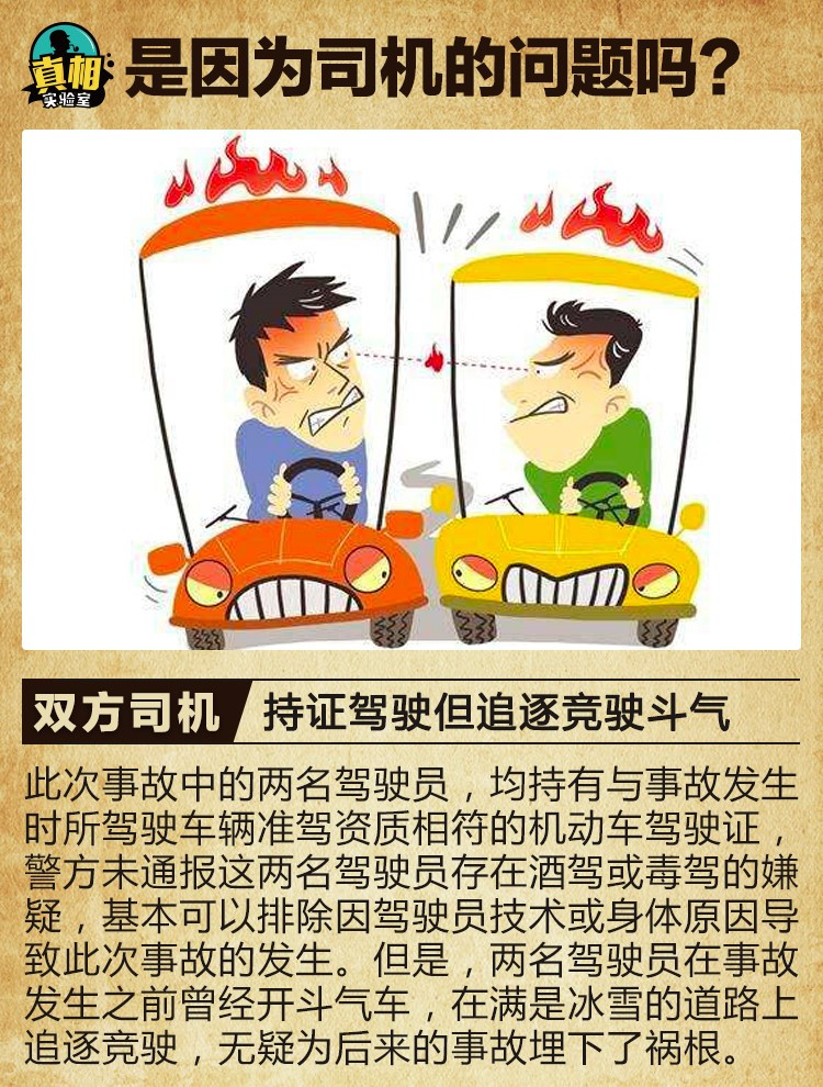 但是重要的一点是,两名驾驶员在事故发生之前曾经开斗气车,并且是在满是冰雪的道路上追逐竞驶,无疑为后来的事故埋下了祸根。要知道,事故发生当天,哈尔滨阵雪,最低气温达-20℃,双方车辆行驶的道路上已经满是冰雪。依据我国道路交通安全法的规定,当遇到雨、雪、雾等恶劣天气,并且能见度在50米以内时,机动车行驶的最高时速不得超过30公里。而据知情人士透露,事发那一刻两辆车的行驶速度都在80公里/小时左右,即便不考虑能见度的问题,在冰雪覆盖的路面上也已经是严重的超速驾驶了。何况,在事故发生之前,两辆车的驾驶员正在追逐竞驶开斗气车,更是极大地增加了发生危险的概率。