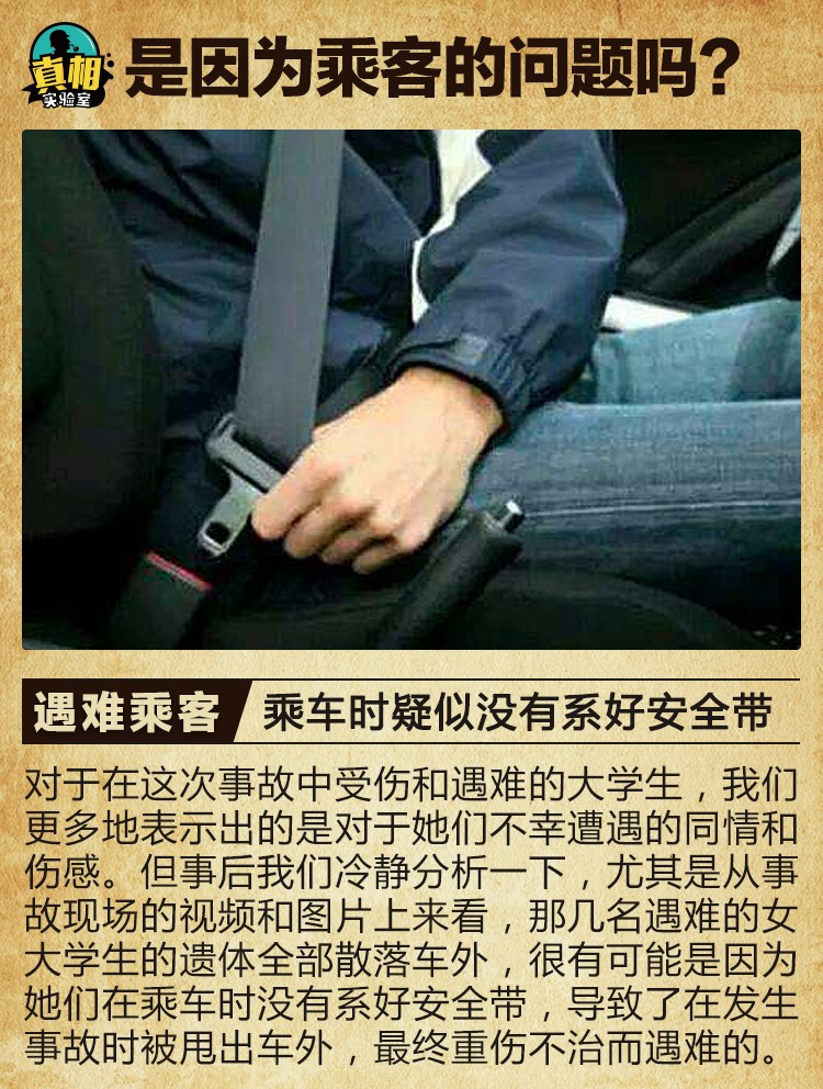 对于在这次事故中那些受伤和遇难的大学生们,我们通常更多地表示出的是对于她们不幸遭遇的同情、伤感和慰问。但在事情过后,如果大家能够冷静地观察并分析一下的话,不难发现这样一个事实,那就是从事故现场的视频和图片来看,那几名遇难的女大学生的遗体全部散落在车外,这很有可能是因为她们在乘车时没有系好安全带,导致了在发生事故的一瞬间,因为剧烈的碰撞而被甩出车外,最终重伤不治而遇难的。