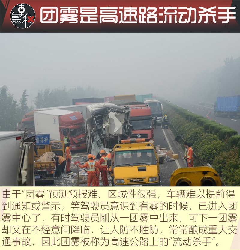 【搜狐汽车 车無秘】不久前,大广高速和兰南高速交叉口附近突发团雾,引发连环车祸,致6人死亡。这绝不是个案。据不完全统计,近几年,高速公路上的多起重大交通事故都与团雾有关。而据高速交警部门统计,我省高速至少20个路段易发团雾。因此对于这个新兴杀手,我们十分有必要去了解它,并学会一些简单的防范手段,以防遭遇时发生不测。