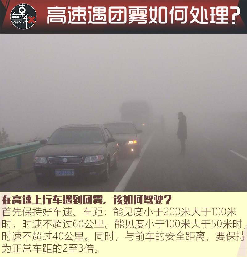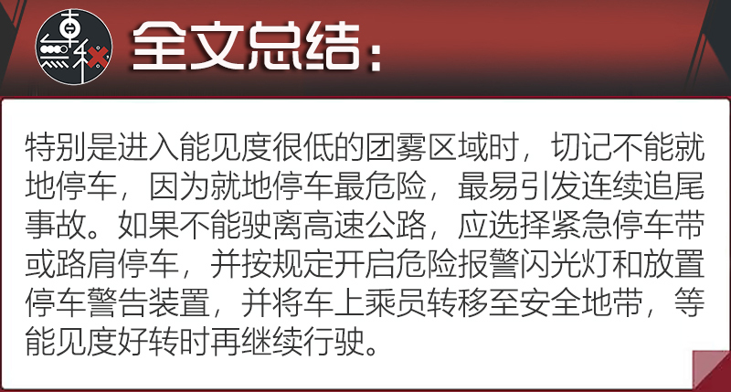 如果车被堵在雾里,要打开应急灯、将三脚架警示牌放到来车方向150米外,车上人员则应迅速撤离到高速公路护栏之外,防止追尾事故发生。