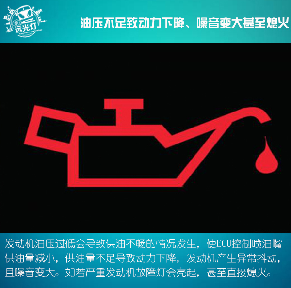 发动机油压过低会导致供油不畅的情况发生,使ECU控制喷油嘴供油量减小,供油量不足导致动力下降,发动机产生异常抖动,且噪音变大。如若严重发动机故障灯会亮起,甚至直接熄火。