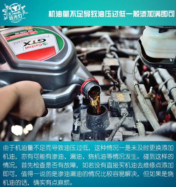 解决方法:由于机油量不足而导致油压过低,这种情况一是未及时更换添加机油,亦有可能有渗油、漏油、烧机油等情况发生。碰到这样的情况,首先检查是否有故障,如若没有直接买机油去维修点添加即可,值得一说的是渗油漏油的情况比较容易解决,但如果是烧机油的话,确实有点麻烦。