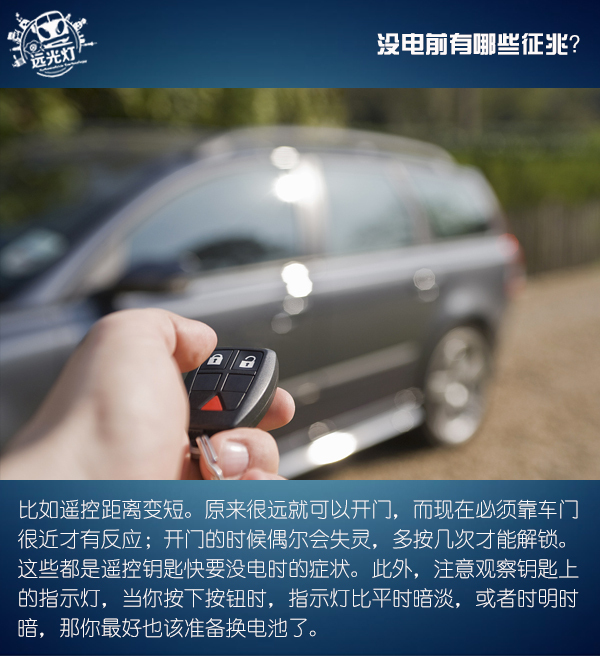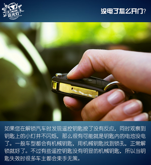 [搜狐汽车 远光灯](图/文 李鹏)遥控钥匙几乎已成为如今汽车上的标配,解锁、锁车、开启后备箱等都变得更加方便,但是偶尔也会遇到遥控钥匙“失灵”的时候。无论怎么按,汽车也没有反应,是车坏了还是钥匙坏了?如果真的是遥控钥匙没电了,怎么把车开走呢?没钥匙孔的话又怎么启动车呢?来听远光君给你答疑解惑吧。