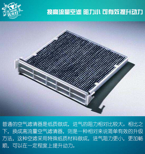 相比之下,换成高流量空气滤清器,则是一种相对来说简单有效的升级方法,这种空滤采用特殊纸质材料做成,进气阻力更小,更加畅顺,可以在一定程度上提升动力。