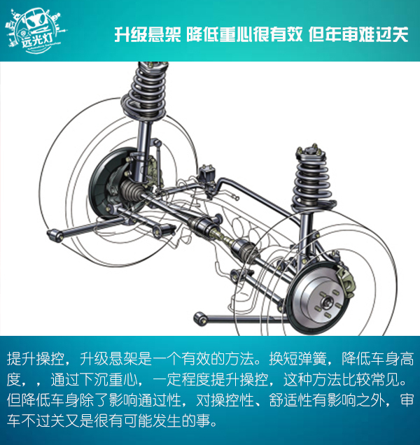 提升操控,升级悬架是一个有效的方法。换短弹簧,降低车身高度,,通过下沉重心,一定程度提升操控,这种方法比较常见。但降低车身除了影响通过性,对操控性、舒适性有影响之外,审车不过关又是很有可能发生的事。