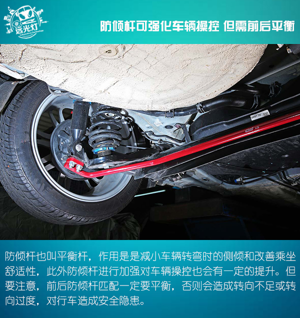 防倾杆也叫平衡杆,作用是是减小车辆转弯时的侧倾和改善乘坐舒适性。除了改避震器,防倾杆进行加强对车辆操控也会有一定的提升。改装的防倾杆,通常会更粗壮,弹性系数更大,能更好抵抗侧倾的力。但一定要注意,前后防倾杆匹配一定要平衡,否则会造成转向不足或转向过度,对行车造成安全隐患。