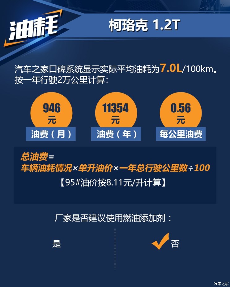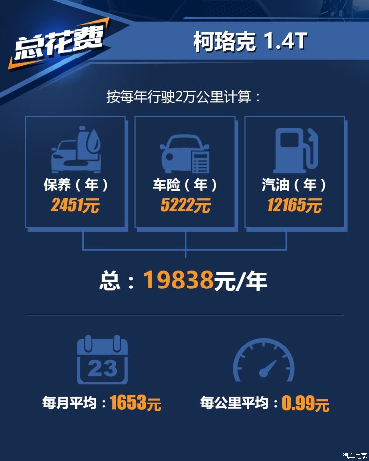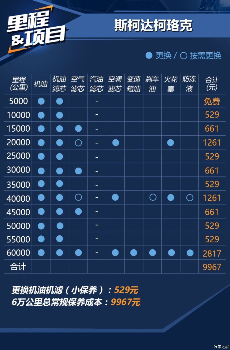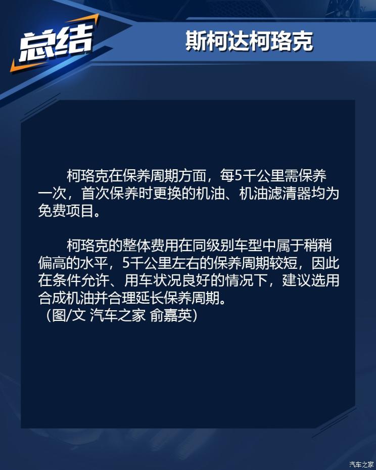 可以看出柯珞克后期成本并不像它的售价那样亲民,以3年行驶6万公里左右来估算需要9967元(仅使用原厂矿物油的情况下)的保养费用,但好在当后期成本均摊至每月或是每公里的平均成本之后,还可以为大多数消费者所接受,而导致整体保养成本稍稍偏高主要还是因为4S店要求的车辆保养里程数较短(每5千公里保养一次)。(图/文 汽车之家 俞嘉英)