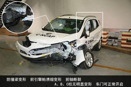 事件还原:2014年2 月20日下午,在中国汽车技术研究中心的实车碰撞试验室内,长安福特厂家技术人员准备完成翼搏1.5AT 尊贵型(ECOSPORT CAF7150B4)正面40% 重叠可变形壁障碰撞试验。各路媒体记者在现场见证了测试实验的同时,还观看了一场Live版的断轴大戏。现场图片显示翼搏在40% 偏置碰撞的时候A 、B 、C 柱无明显变形,车门可正常开启,乘员可自行打开车门自救逃生,但前轴断裂,左侧翼子板出现变形。去年一位车主刚提的新车,从4S店开回家的过程中发生了断轴,4S店鉴定说车辆撞到路牙子爆胎导致了断轴。
