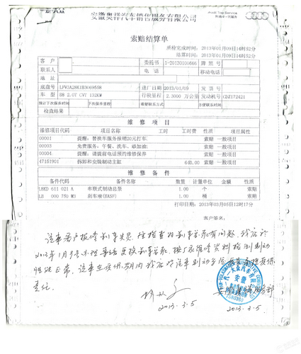 “从那次维修后,开了有小半年时间,直到今年元旦,车子又出现了同样的问题,而且比第一次还严重,几乎刹不住车了。我便打电话给4S店,4S店让我开慢点到他们那去,当时很生气,没刹车的车你还敢让我开过去?刹车是关系到安全的问题,不是一般的小毛病好吧?于是我就打电话给奥迪厂家,奥迪厂家的态度也不怎样,告之会安排人员跟我联系,下午就接到安徽奥祥4S店的技术总监的电话,我让他叫拖车来给拖走了。车在4S店待了一个星期,2013年1月9号给我打电话说车子制动总泵有问题,跟厂家联系了帮我更换了。我一想,这次不是光修,还帮我换了总泵了,应该没问题了吧?我就把车开走了。”