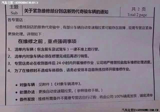内部资料称“紧急更换新势代奇骏自动变速箱拉索”