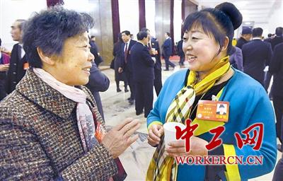 3月10日下午,进城打工近20余年的农民工、全国人大代表陈雪萍(图右)在人民大会堂说,农民进城务工,尤其是在建筑工地上,最怕的也是最愁的就是“恶意欠薪”。“干一年要拿不回来工钱,家里老人、孩子吃什么?”中工网记者 许之丰 摄