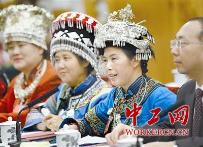 两会期间,代表委员围绕文化体制改革、公共文化服务、传统文化传承发扬、文化产业等议题展开讨论,为社会主义文化强国建设建言献策。全国人大代表王菁(右二)认为,要鼓励发展民族地区的传统文化工艺,这样既可以增加农民收入,又可以丰富人们的文化生活。 新华社记者 刘卫兵 摄
