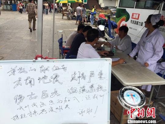 上午十点,记者在昆明南屏街闹市采血点看到,献血点树立了宣传地震献血的牌子,前来献血的市民一个接一个。工作人员保见坤告诉记者:“下雨再加上学生放假这些天人数较少,今早献血人数比平常多出十多位,都是得知地震消息后来的,下午会更多。”
