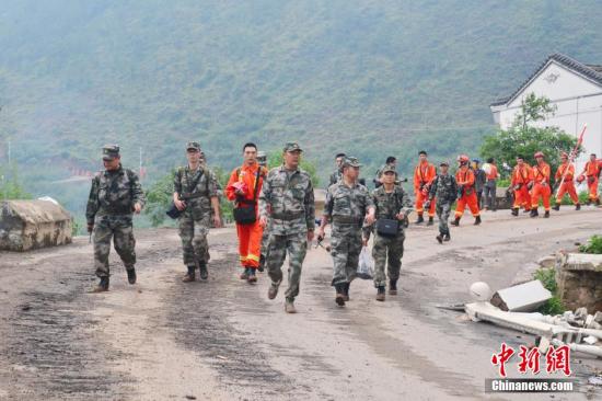 8月4日,云南预备役师徒步进入震中龙头山镇。8月3日,云南昭通市鲁甸县龙头山镇发生6.5级地震。当日下午18时,云南预备役师首批出动170人专业应急救援力量分別从昆明、楚雄、玉溪、曲靖四个方向进入灾区。 史广林 摄