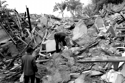 房屋倒塌后,村民在搜罗可用的物资。京华时报记者张剑摄