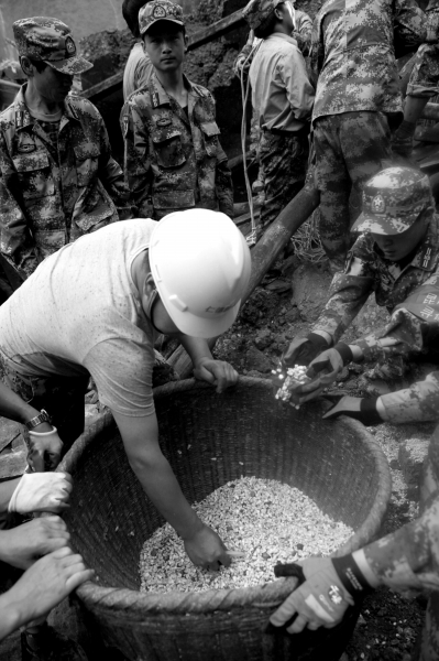 来自昆明警备区的官兵和民兵,为一名房子坍塌的老乡捡回散落的苞谷等生活物品。新华社发