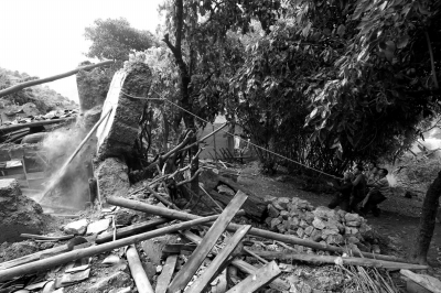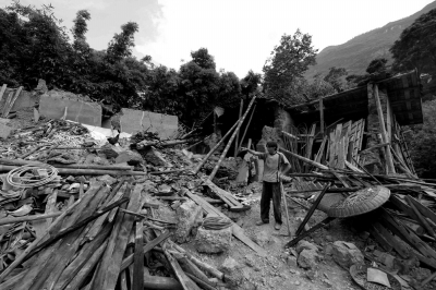 村民吴宏万在自家废墟中寻找衣服和棉被。京华时报记者潘之望摄