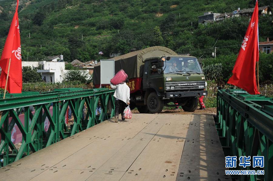 8月6日,一辆救灾车辆正在通过新架成的龙泉河桥。通往震中龙头山镇的“咽喉桥”——龙泉河桥8月5日晚顺利架成,这标志着鲁甸地震发生后一直中断的通往震中的道路终于打通。