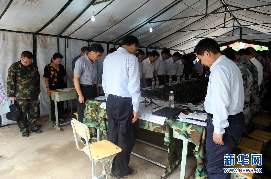 8月3日下午4时30分,云南省鲁甸县发生6.5级地震。党中央、国务院高度重视,中共中央总书记、国家主席、中央军委主席习近平和中共中央政治局常委、国务院总理李克强立即作出重要指示和批示。4日一早,李克强代表党中央、国务院,代表习近平总书记急飞灾区察看灾情,现场指挥抗震救灾工作。一上飞机,李克强就召开紧急会议,听取汇报,详细了解灾情、群众伤亡和救援进展,部署救灾工作。飞抵地震灾区后,李克强即乘车赶往此次地震的震中鲁甸县龙头山镇,并徒步5公里多来到受灾最严重的龙泉村,实地察看灾情。随后,李克强在镇中学操场上的帐篷里召开现场会,协调解决抗震救灾中的问题。入夜,李克强又忙着到库房察看救灾物资的储备、配发等情况,并细心地叮嘱司机争分夺秒运输的同时要确保安全。次日一大早,他来到鲁甸县人民医院,看望这里收治的地震伤员,慰问医护人员。两天时间里,地震灾区留下了总理忙碌的身影。这是8月4日,李克强在震中龙头山镇中学操场上的帐篷里召开现场会,协调解决抗震救灾中的问题。会议开始时,李克强和参加会议的全体同志向此次地震中的不幸遇难者默哀。新华社记者姚大伟摄
