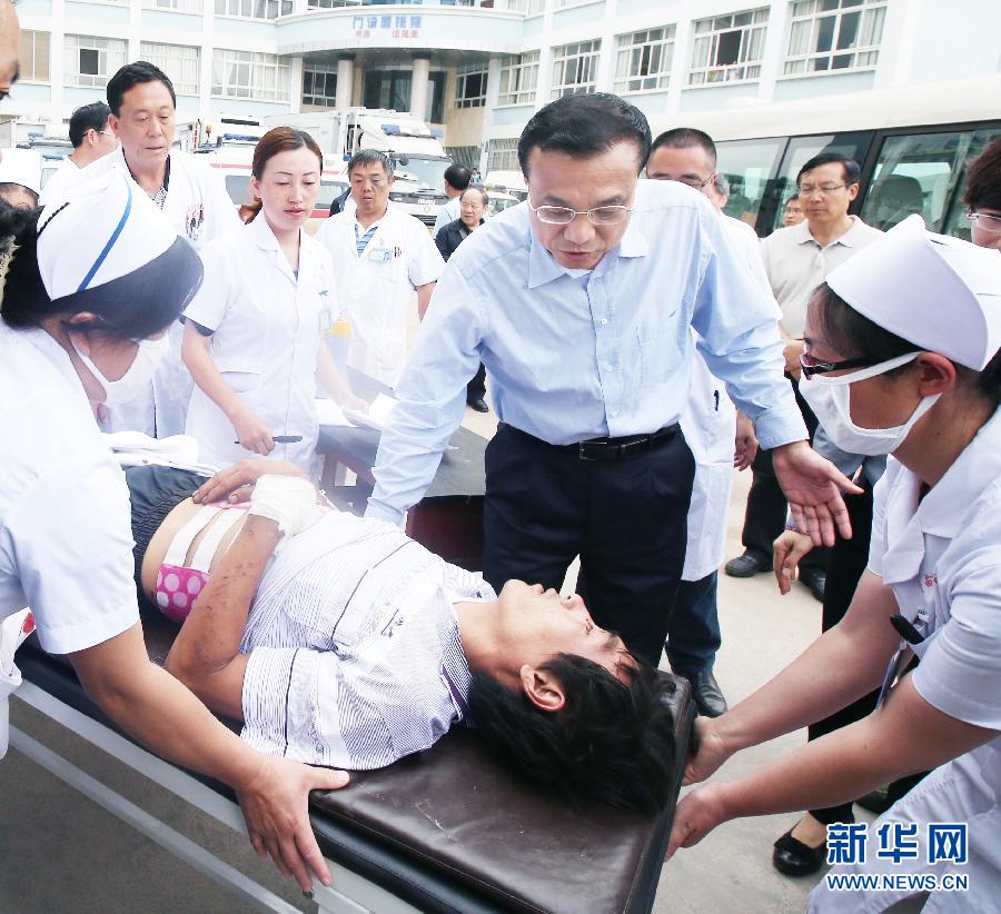 8月3日下午4时30分,云南省鲁甸县发生6.5级地震。党中央、国务院高度重视,中共中央总书记、国家主席、中央军委主席习近平和中共中央政治局常委、国务院总理李克强立即作出重要指示和批示。4日一早,李克强代表党中央、国务院,代表习近平总书记急飞灾区察看灾情,现场指挥抗震救灾工作。一上飞机,李克强就召开紧急会议,听取汇报,详细了解灾情、群众伤亡和救援进展,部署救灾工作。飞抵地震灾区后,李克强即乘车赶往此次地震的震中鲁甸县龙头山镇,并徒步5公里多来到受灾最严重的龙泉村,实地察看灾情。随后,李克强在镇中学操场上的帐篷里召开现场会,协调解决抗震救灾中的问题。入夜,李克强又忙着到库房察看救灾物资的储备、配发等情况,并细心地叮嘱司机争分夺秒运输的同时要确保安全。次日一大早,他来到鲁甸县人民医院,看望这里收治的地震伤员,慰问医护人员。两天时间里,地震灾区留下了总理忙碌的身影。这是8月5日一大早,李克强在鲁甸县人民医院门前广场安慰救护车刚送来的一位伤员。 新华社记者姚大伟摄