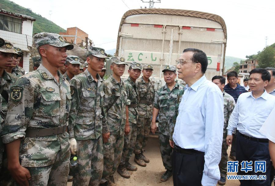 8月3日下午4时30分,云南省鲁甸县发生6.5级地震。党中央、国务院高度重视,中共中央总书记、国家主席、中央军委主席习近平和中共中央政治局常委、国务院总理李克强立即作出重要指示和批示。4日一早,李克强代表党中央、国务院,代表习近平总书记急飞灾区察看灾情,现场指挥抗震救灾工作。一上飞机,李克强就召开紧急会议,听取汇报,详细了解灾情、群众伤亡和救援进展,部署救灾工作。飞抵地震灾区后,李克强即乘车赶往此次地震的震中鲁甸县龙头山镇,并徒步5公里多来到受灾最严重的龙泉村,实地察看灾情。随后,李克强在镇中学操场上的帐篷里召开现场会,协调解决抗震救灾中的问题。入夜,李克强又忙着到库房察看救灾物资的储备、配发等情况,并细心地叮嘱司机争分夺秒运输的同时要确保安全。次日一大早,他来到鲁甸县人民医院,看望这里收治的地震伤员,慰问医护人员。两天时间里,地震灾区留下了总理忙碌的身影。这是8月4日,李克强在震中龙头山镇与抗震救灾的官兵交谈。 新华社记者姚大伟摄