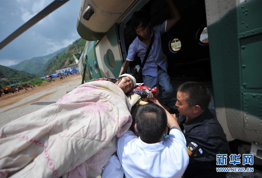 8月5日,在鲁甸县龙头山镇,救援人员将受伤人员抬上直升机向昭通转移。新华社记者 薛玉斌 摄