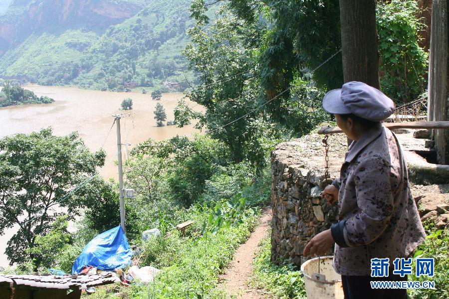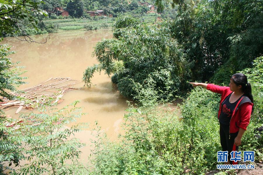 8月5日,会泽县江边村村民刘宗秀看着远处自己被淹的房子。