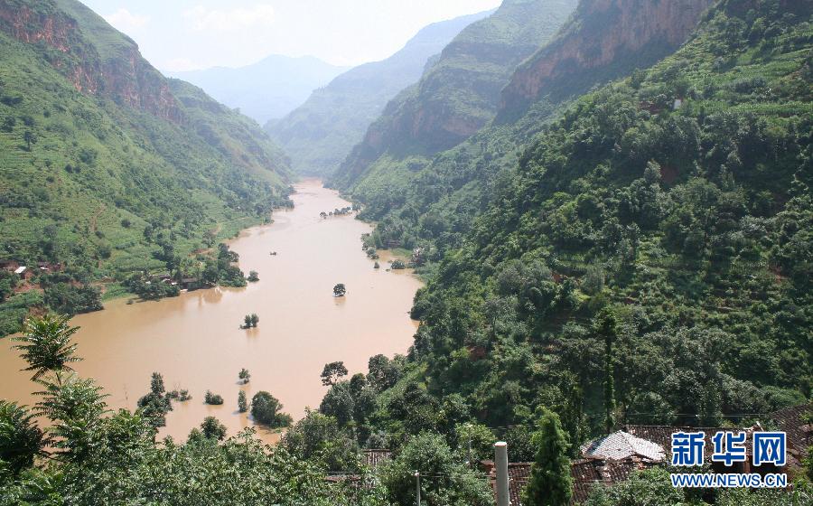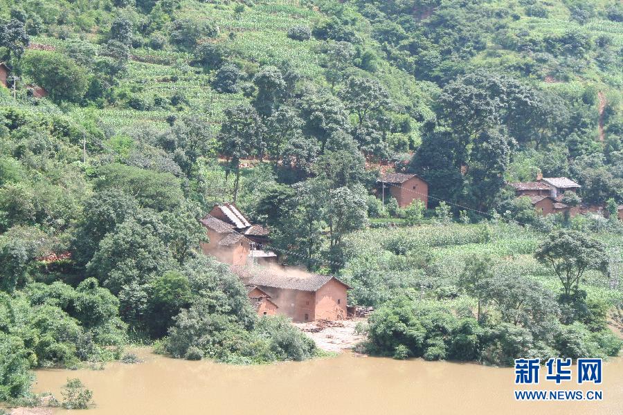 8月5日13时左右,牛栏江边一处进水民房发生倒塌。新华社记者 李伟 摄