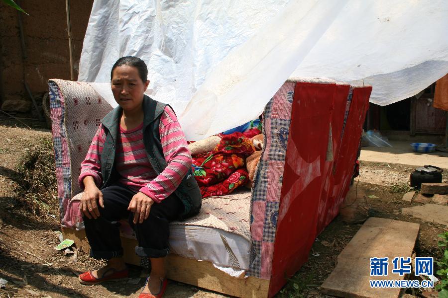 8月5日,一位村民指着几片碎木,那里曾经是她的家。新华社记者 浦超 摄