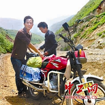 罗文(左)和表哥载着矿泉水和蔬菜在回乡路上。