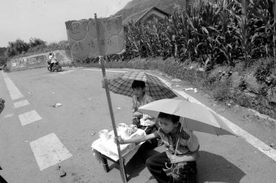 两个孩子在骄阳下打着伞摆茶摊。京华时报记者陶冉摄