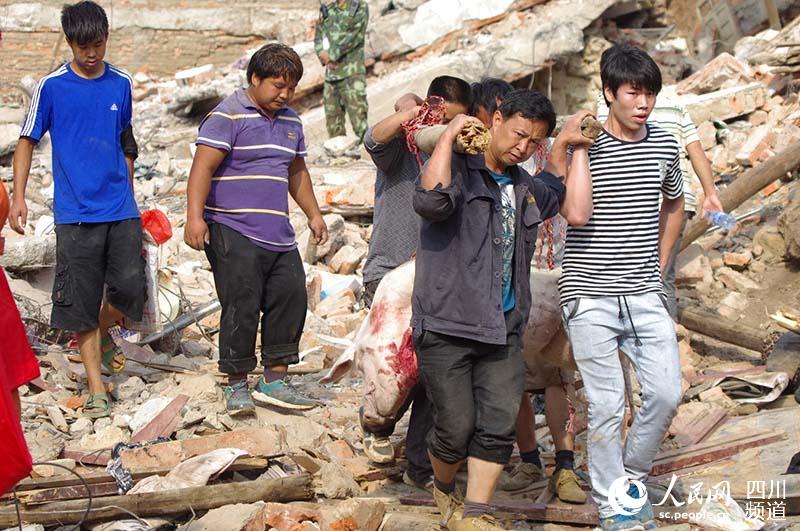 村民们自发将自己家的猪杀了送给参与救援的官兵,图为村民们抬着猪从废墟上走过。(陈永斌摄)