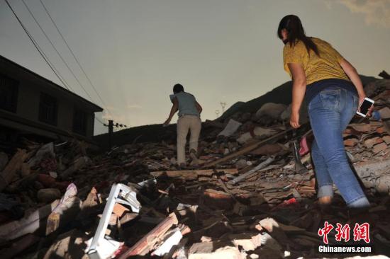 8月7日,云南鲁甸龙头山镇,村民从废墟前经过,搜寻可用物品。中新社发 张浪 摄