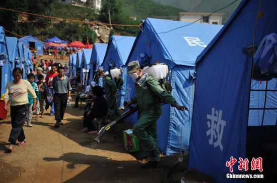 8月7日,十四集团军防化团官兵在龙头山镇安置点进行洗消作业。近期云南鲁甸地震灾区天气炎热,为防止疫情发生,防化团官兵每天多次对灾区重点地区进行洗消作业。中新社发 刘冉阳 摄