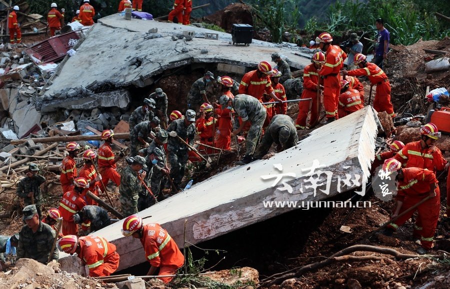 甘家寨现场正在开展的大规模搜救工作。 云南日报记者 禹江宁 摄