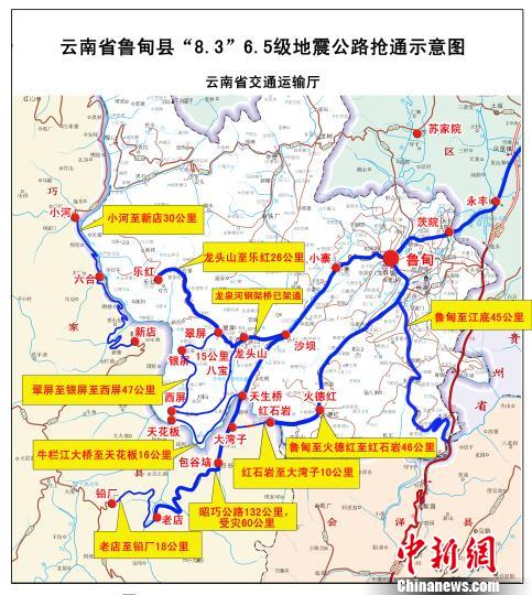 龙头山至乐红(施初)公路是龙头山通往翠屏、乐红(施初)的唯一通道,全长24公里,在地震中损毁严重,全线中断,其中约1公里路基全毁需改线,抢通难度大。为及时打通该路,省市县三级交通部门组织人员多次勘查,认真研究制定公路抢通施工方案,经过云南建工、武警交通及交通部门精心组织,日夜奋战,龙头山至乐红(施初)公路于8日上午9:30成功抢通。
