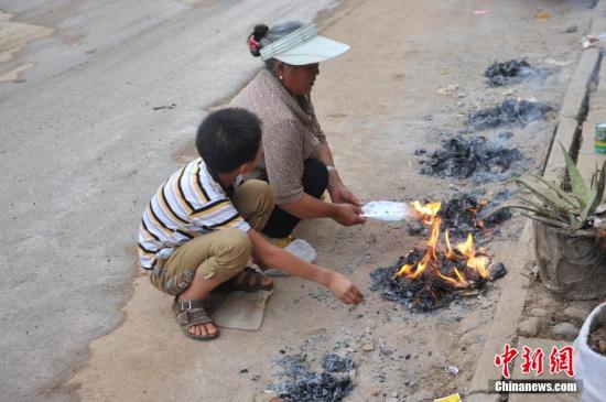 8月8日,云南鲁甸县民众在公路边烧纸钱祭奠在地震中逝去的亲人。张浪 摄