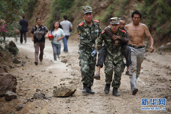 云南鲁甸6.5级地震发生以来,媒体记者们快速反应、奋勇向前,用自己的辛勤付出,第一时间向关心灾区的人们介绍地震灾情、讲述救灾进展、记录灾难面前的人性与大爱。让我们记住这些来自抢险救灾一线的画面,为那些需要帮助的人传递更多温暖的力量。愿逝者安息,生者坚强! 8月3日,武警战士在云南鲁甸地震现场转移伤员。 新华社发(张广玉摄)