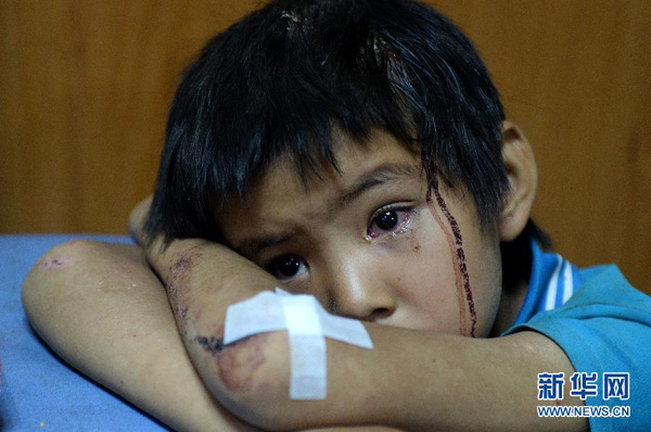 8月3日深夜,一名孩子在鲁甸县人民医院接受医治。 新华社记者胡超摄
