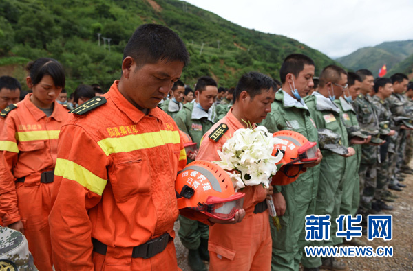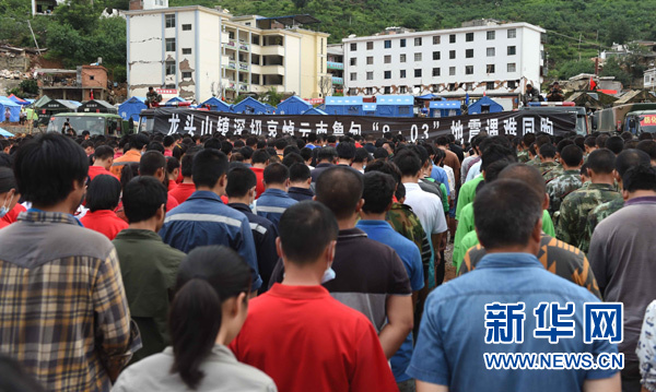 10时整,国家有关部委和云南省市县各级各部门党政军领导及各界代表100余人静静肃立,佩戴着白色的纸质胸花,低头默哀。会场外,汽车喇叭声、警报声响彻县城。三分钟后,各界代表在充满哀伤的《思念曲》中,缓缓依次向遇难同胞敬献黄色和白色菊花。